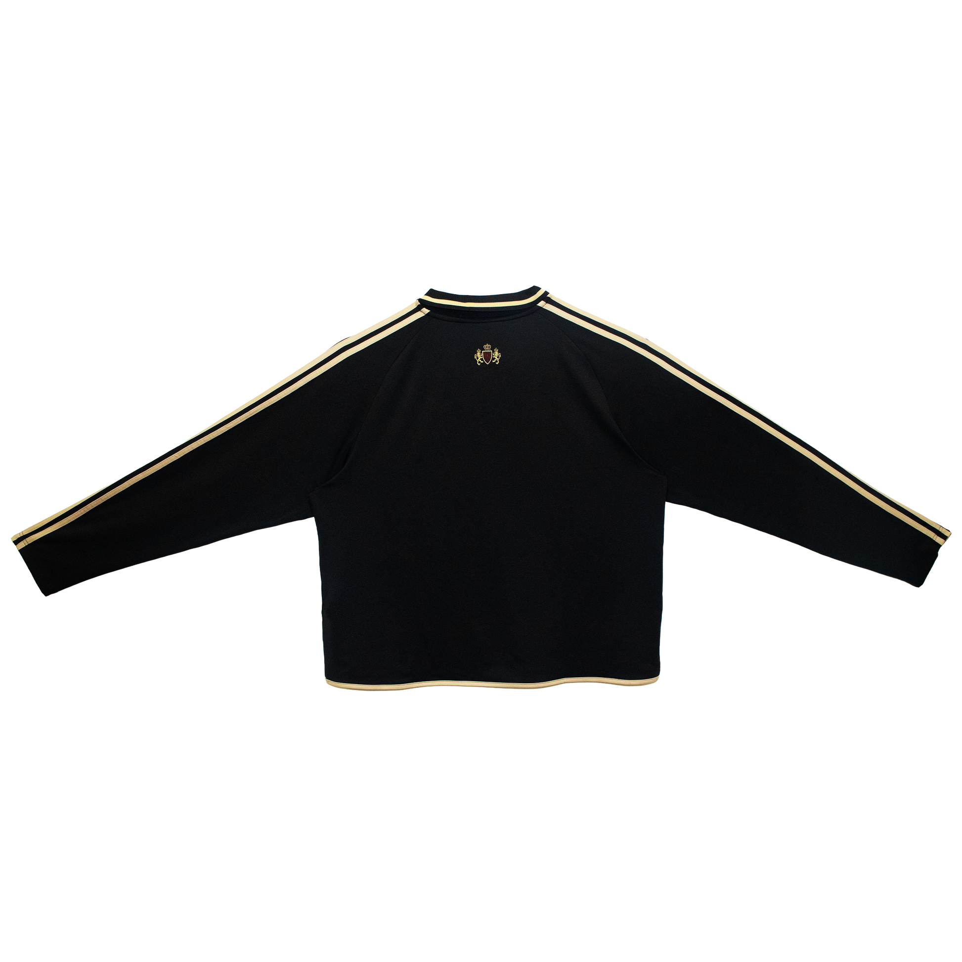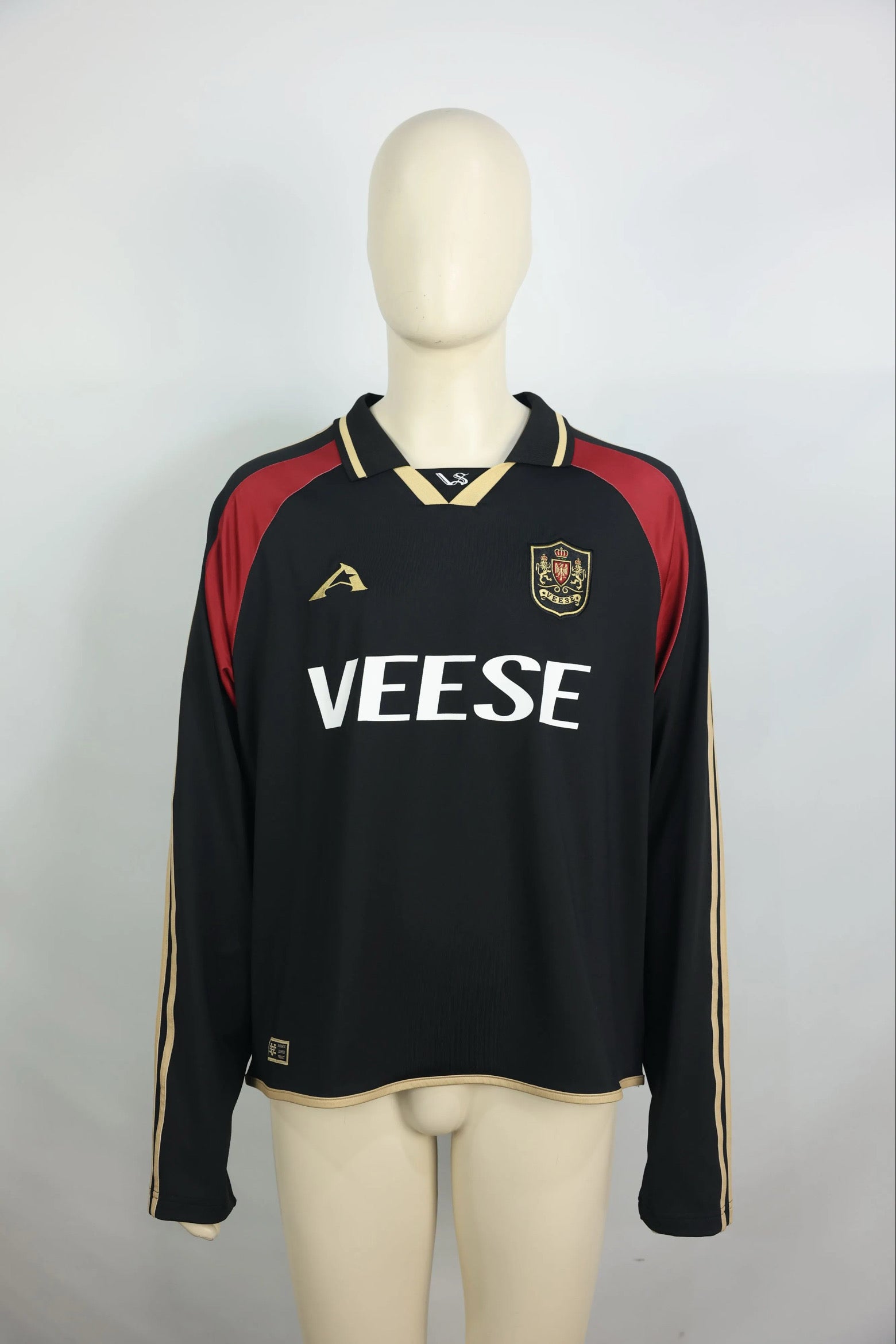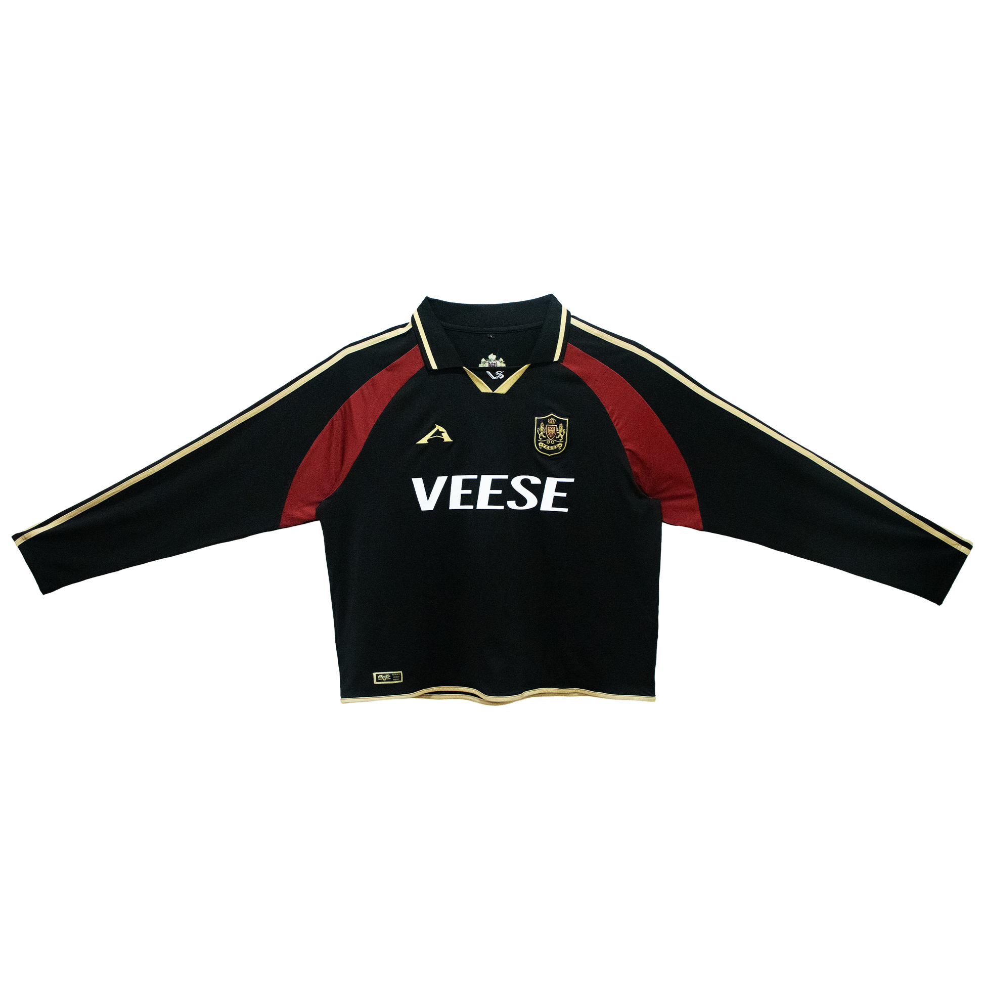 Relaxed football-inspired long-sleeve jersey built from breathable performance mesh with a boxy, slightly cropped silhouette. Designed in a deep black base with gold and crimson paneling for a vintage European-club feel. Features the signature VEESE wordmark across the chest, a heraldic crest at the left chest, and gold racing stripes along both sleeves. Finished with contrast gold trim at the collar, cuffs, and hem, plus embroidered crest detailing at the upper back.